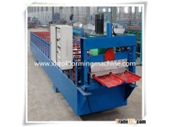 Tile forming machine consist of uncoiler,coil sheet guiding and adjusting device,covering film device,main roll forming system,pressing device,cutting device,hydraulic station,PLC control system and support table.